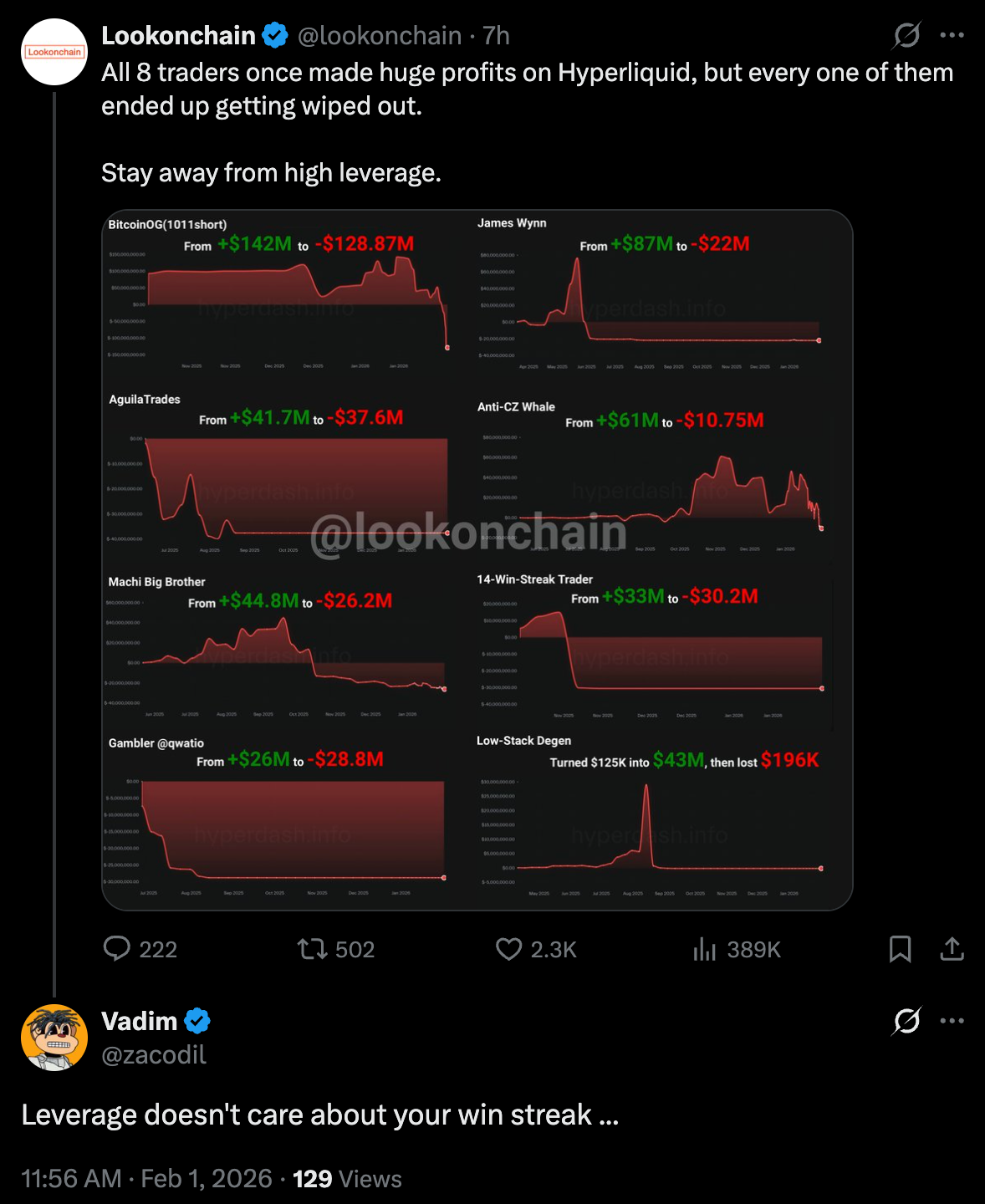 По данным Lookonchain, серьезные убытки на крупнейшей perp-DEX понесли восемь топ-трейдеров.