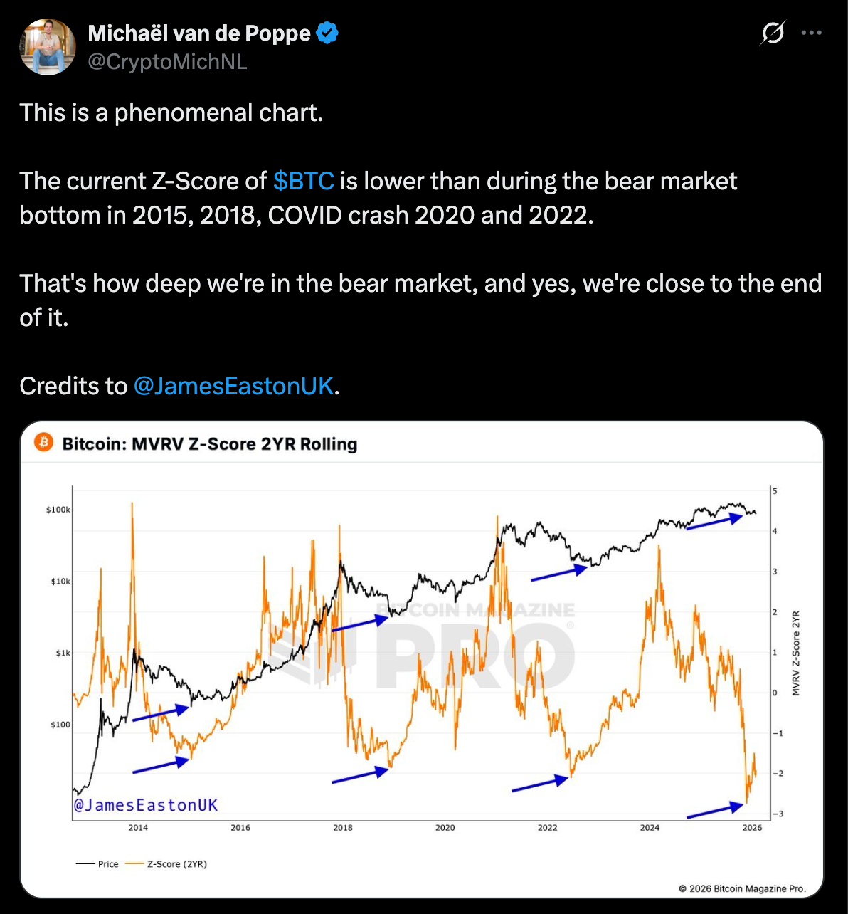 Основатель MN Fund Михаэль ван де Поппе отметил, что индикатор MVRV Z-Score опустился ниже минимумов медвежьих циклов 2015, 2018 и 2022 годов.