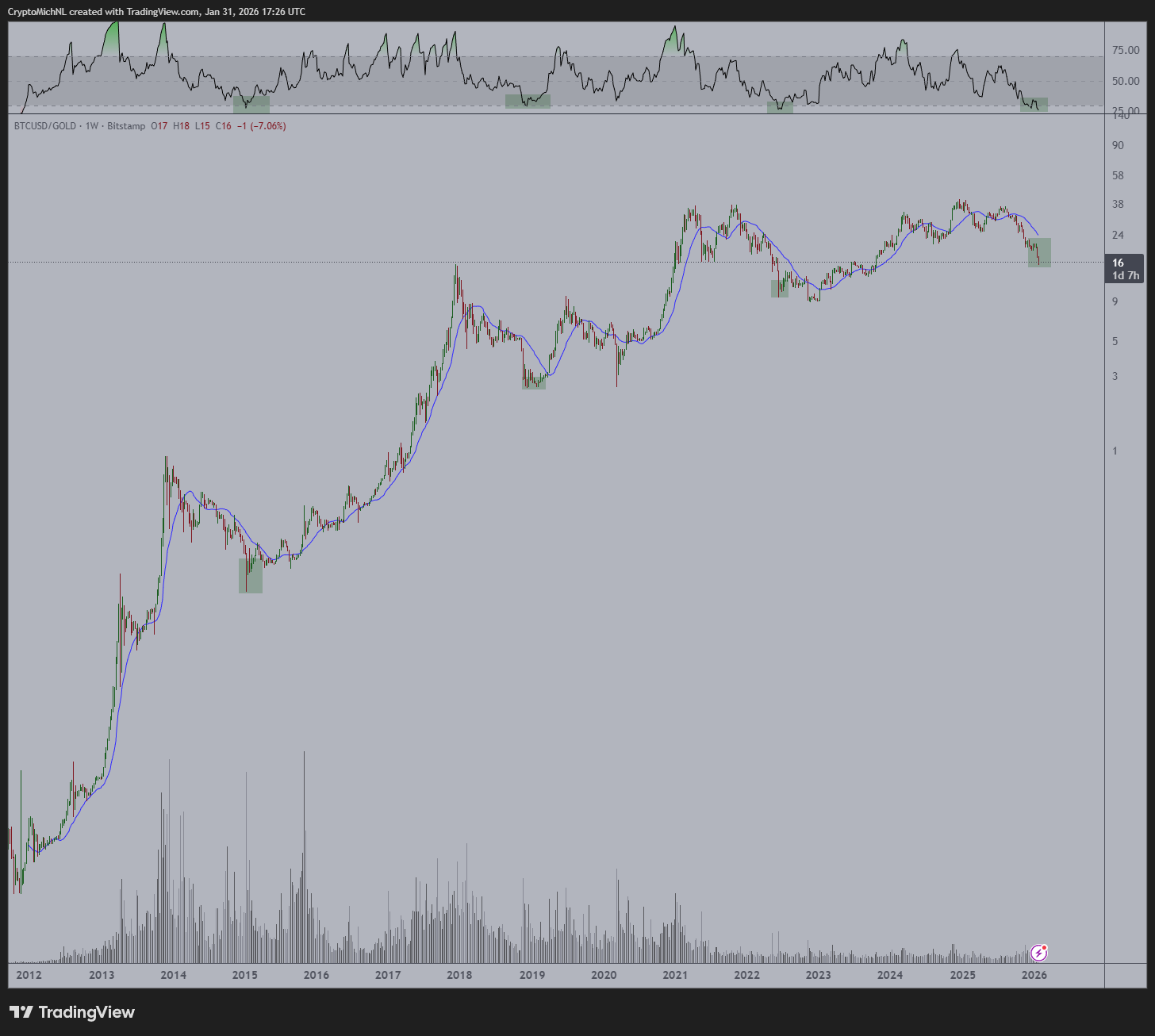 Михаэль ван де Поппе обратил внимание на другой сигнал: недельный RSI на графике биткоина в паре с золотом упал ниже 30.
