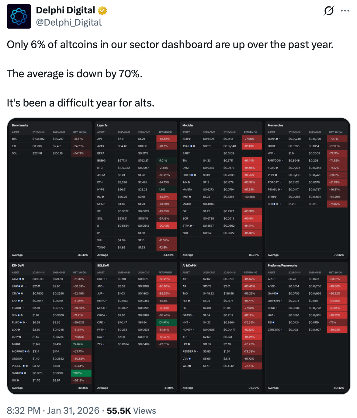 Аналитики Delphi Digital констатировали: за последние 12 месяцев рост показали лишь 6% альткоинов. Средняя просадка по сектору составила 70%.