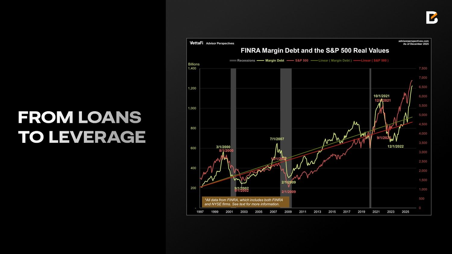 За последний год объем кредитования бизнеса и промышленности существенно сократился по сравнению с 2024 годом, а потребительское кредитование продемонстрировало схожую слабость. При этом, согласно данным VettaFi, маржинальный долг вырос на 36,3% за год и достиг исторического максимума $1,23 трлн в декабре 2025 года, а чистые дебетовые балансы инвесторов увеличились до −$814,1 млрд, практически повторив темпы роста маржинального долга.