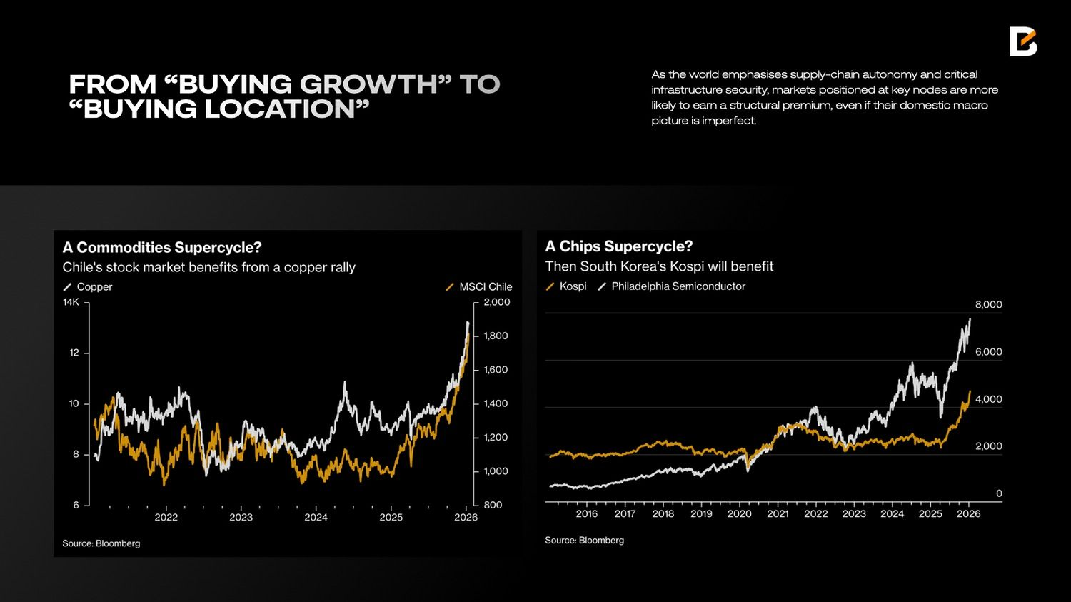 Если в 2010–2021 годах распределение акций в портфелях в основном сводилось к покупке роста и снижения ставок дисконтирования, то в 2026 году речь идет о покупке локации. Под локацией понимается положение рынка на трех картах: ресурсной, вычислительной и карте безопасности. В мире, где приоритетом становится автономия цепочек поставок и защита критической инфраструктуры, рынки, находящиеся в ключевых узлах, способны получать структурную премию даже при несовершенной внутренней макроэкономике.