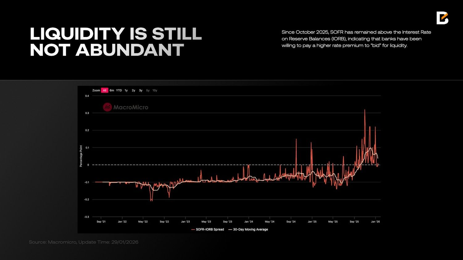 Дополнительную картину стресса показывает спред между ставкой SOFR и ставкой по резервам (IORB). Если EFFR в основном отражает условия денежного рынка, то SOFR, представляющая собой обеспеченное финансирование под залог казначейских бумаг США, указывает на более широкий дефицит ликвидности. С октября 2025 года SOFR стабильно превышает IORB, что говорит о готовности банков платить повышенную премию за доступ к ликвидности.