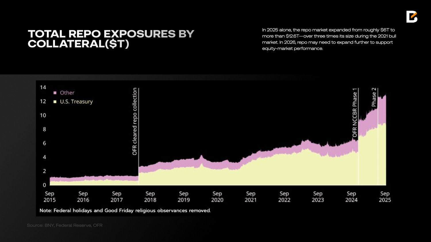 В результате только за 2025 год рынок репо вырос примерно с $6 трлн до более чем $12,6 трлн — более чем втрое превышая свои размеры времен бычьего рынка 2021 года. В 2026 году объем операций репо, вероятно, потребуется увеличить еще больше для поддержки фондового рынка.