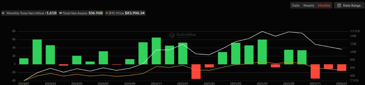 Сектор криптовалютных ETF также демонстрирует негативные показатели. В месячном разрезе спотовые биткоин-ETF уже трижды демонстрируют отток капитала. За ноябрь и декабрь 2025 года, а также январь 2026 года показатель практически достиг $6,2 млрд. Из Ethereum-ETF за аналогичный период вывели $2,38 млрд.