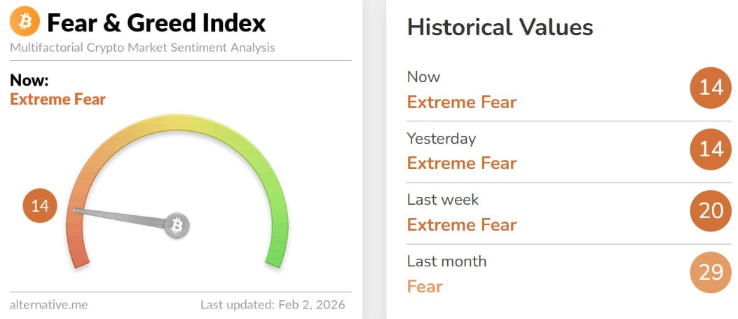 Индекс страха и жадности снова опустился в зону «экстремального страха» и составляет 14 пунктов.