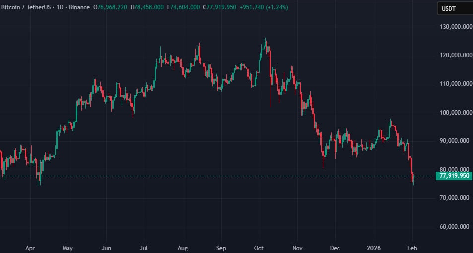 В период с 29 января по 2 февраля 2026 года цена биткоина продемонстрировала стремительное падение, потеряв более 15% стоимости за пять дней. В моменте курс первой криптовалюты опустился ниже отметки $75 000 — это худший показатель с апреля 2025 года. Следом за биткоином в коррекцию пошли и другие цифровые активы.