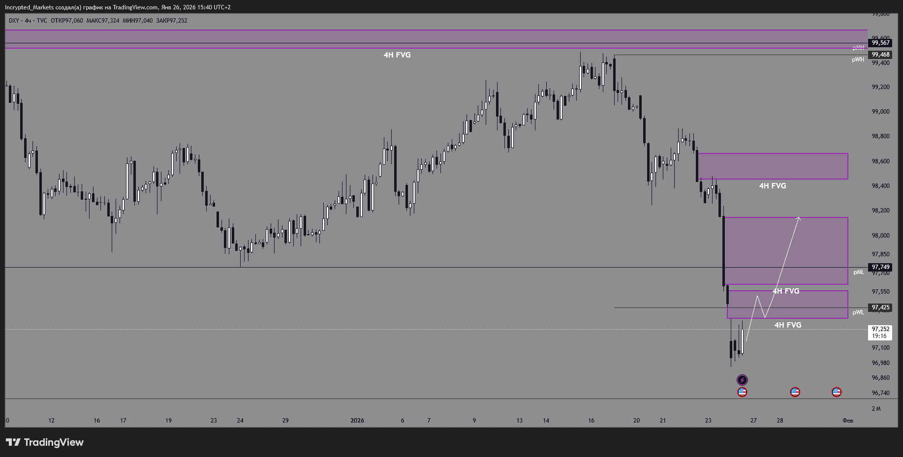 На прошлой неделе индекс доллара отработал как по учебнику: дошел до верхней зоны pWH + 4H FVG (99,49-99,57), но импульс угас. Закрепления сверху не было, вместо этого произошел откат назад в диапазон. Именно это отказное движение позволило крипте и рисковым активам немного передохнуть в конце недели.