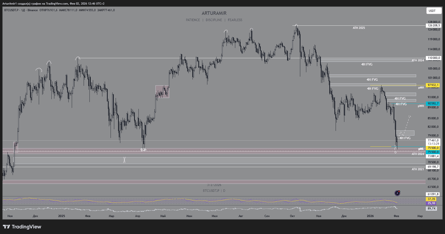 На данный момент наименее вероятный, но наиболее желательный сценарий. Закрытие гэпа с последующим движением к $80 000-$82 000, закреплением и проторговкой уровня.