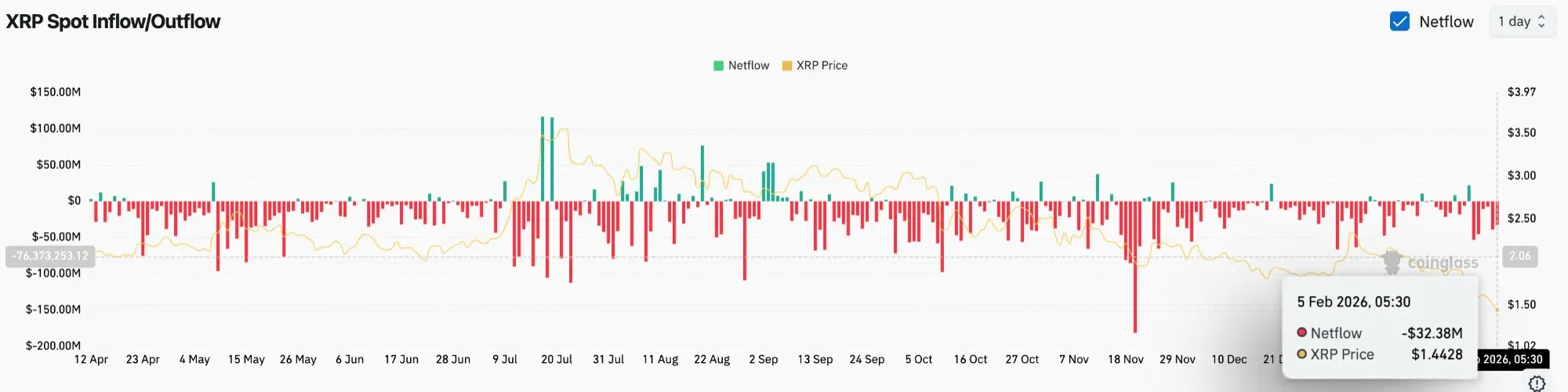 Данные Coinglass показывают 32,38 миллиона долларов спотовых оттоков по состоянию на 5 февраля, что подтверждает: держатели сокращают экспозицию, а не накапливаются на более низких уровнях. Схема оттока в январе и феврале показывает стабильное распределение без значимых дней притока.