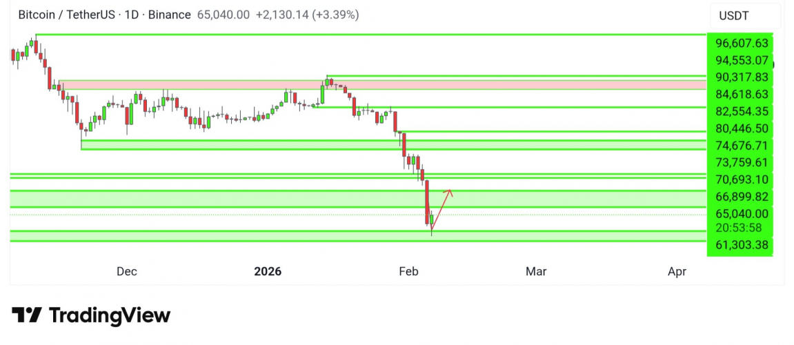 В данный момент биткоин находит поддержку в зоне спроса $61 000-58 000, которая соответствует недельному и дневному уровням, отмечает Crypto Candy. Если эта поддержка удержится, возможен отскок к области $70 000-67 000. Однако до восстановления уровня $70 000 общая тенденция остается медвежьей.