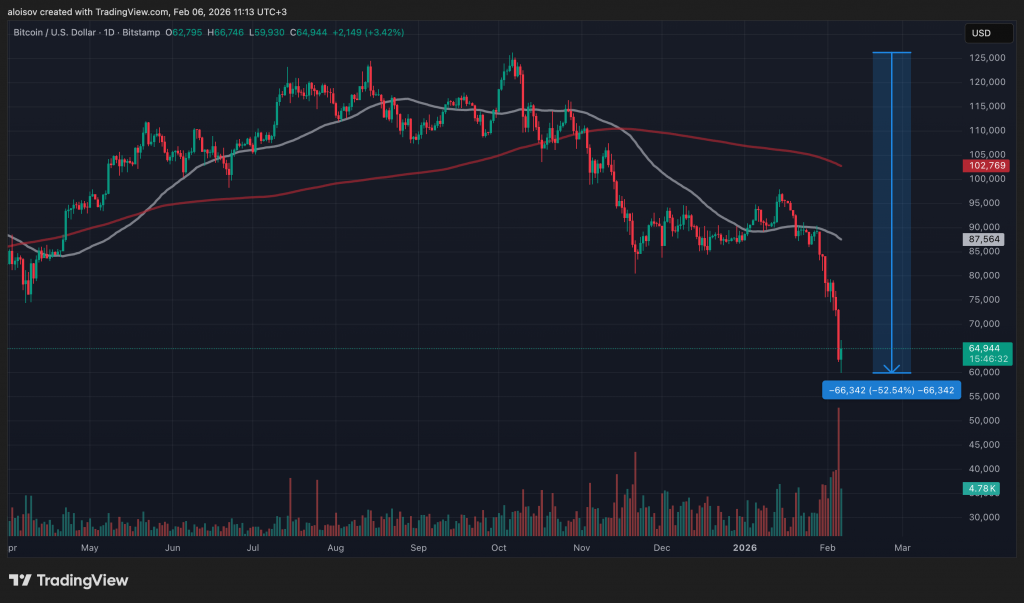 Биткоин зафиксировал первое в истории дневное падение более чем на $10 000, достигнув отметки $59 930 на бирже Bitstamp в пятницу, 6 февраля. Это коррекция на 52,5% от исторического максимума, установленного 6 октября.