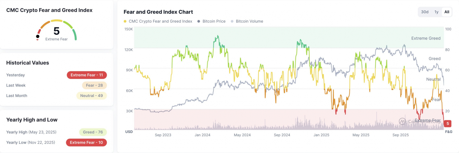 Индекс страха и жадности для криптовалют достиг минимального уровня с момента создания индекса — 5 баллов (экстремальный страх).