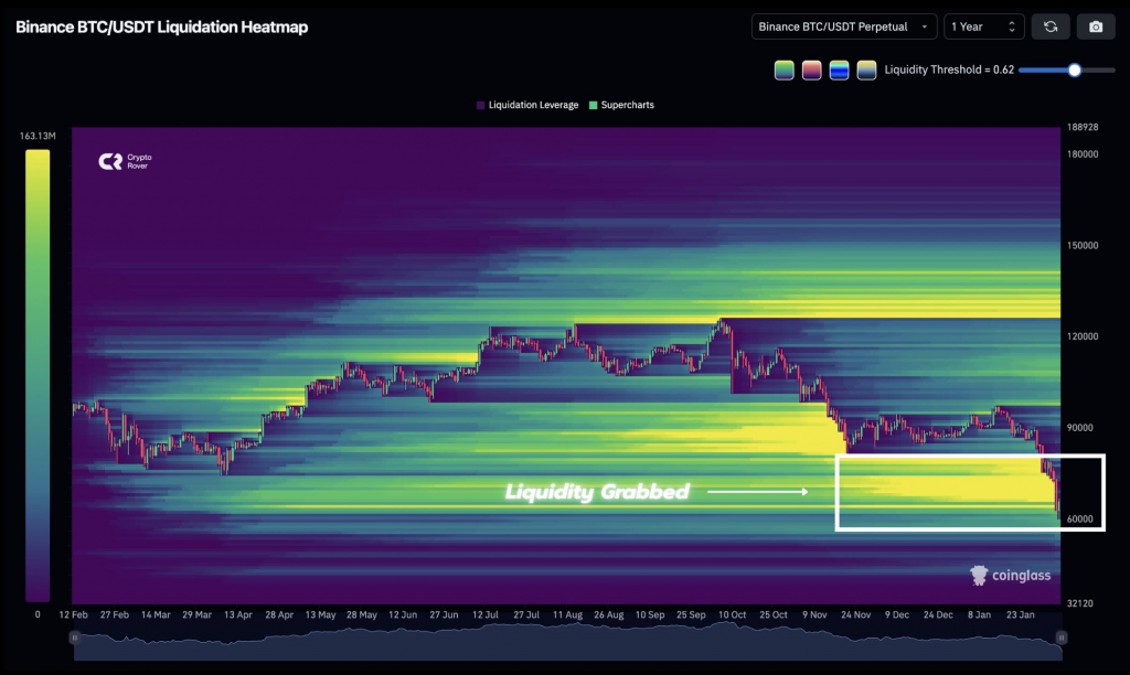 Криптоютубер Crypto Rover фиксирует захват крупного кластера ликвидности по биткоину, что указывает на формирование локального дна.