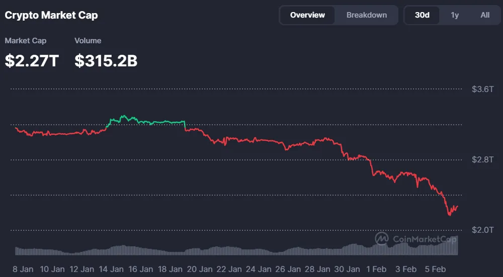 По данным CoinMarketCap, общая капитализация рынка опустилась до $2,27 трлн. Нисходящий тренд продолжается с 14 января 2026 года.