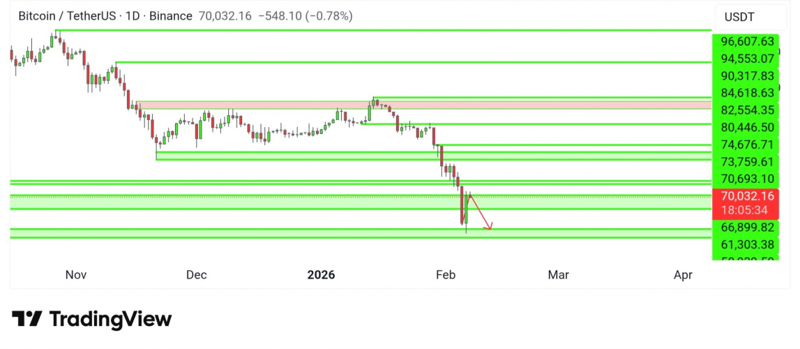 6 февраля биткоин показал первую в истории красную дневную свечу на $10 000. Объем ликвидаций превысил показатели значимых медвежьих событий прошлого, включая обвал на фоне COVID-19 и крах биржи FTX.