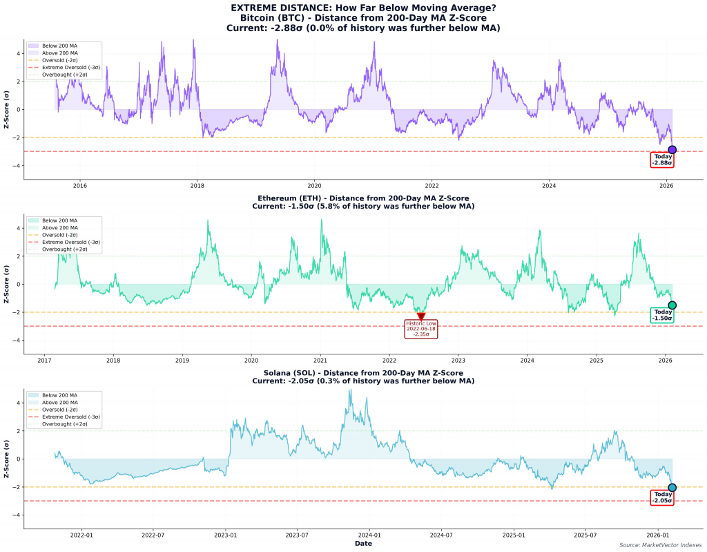 Анализ относит обвал этой недели к 15 самым быстрым в истории биткоина: $BTC/USD упал более чем на 22% за одну неделю, что хуже, чем в 98,9% случаев за всю его историю. При этом отклонение в 2,88 стандартных отклонения ниже 200-дневной скользящей средней превзошло просадки крупных альткоинов Ethereum и Solana.