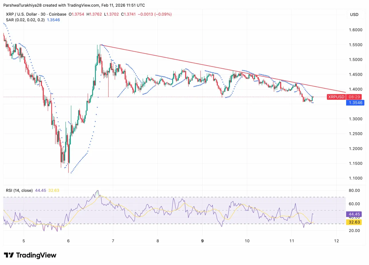 30-минутный график показывает поддержку тестирования $XRP около $1.3702 после пробоя ниже нисходящей линии тренда. Параболические точки SAR находятся выше цены на уровне $1.3546, подтверждая медвежий импульс. RSI держится на уровне 44,45, нейтральный, но снижается, поскольку продавцы защищают каждую попытку отскока.
