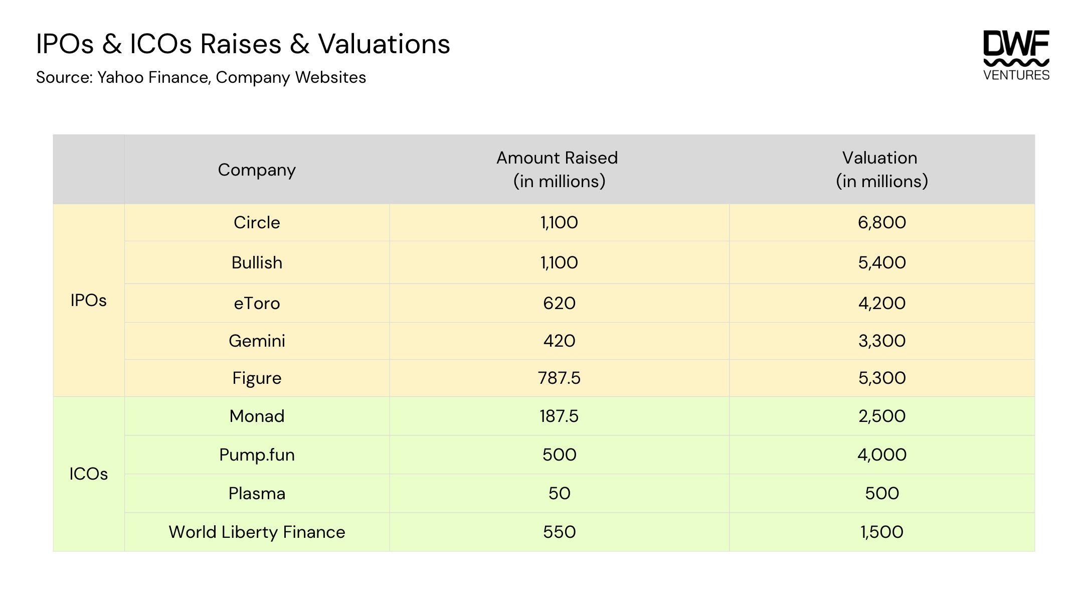 DWF Ventures проанализировала динамику как криптовалютных активов, вышедших на биржи посредством ICO (аналог IPO), так и криптокомпаний, вышедших на биржи через IPO. Выявлено, что криптоактивы показывают взрывной рост только в первые 30 дней, после чего с высокой вероятностью следует жесткая коррекция цены. В это же время акции криптокомпаний «демонстрируют стабильный рост в течение более длительного периода времени».