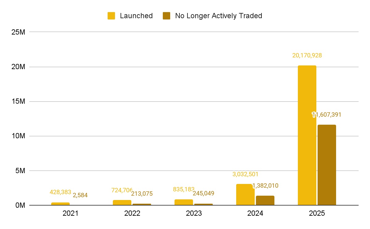По оценке экспертов, слабость альткоинов в этом цикле оказалась более выраженной, чем раньше. Капитал концентрируется в крупнейших монетах, уходя от спекулятивных токенов. Ситуацию усугубил наплыв новых проектов, где из 20,2 млн токенов, запущенных в 2025 году, около 11,6 млн уже перестали активно торговаться. Многие выходили на рынок без работающего продукта и выручки, цены строились на ажиотаже. В итоге большинство из них торгуется намного ниже начальных оценок.