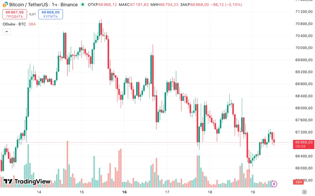 На момент написания первая криптовалюта торгуется около $66 800. За последние сутки цена актива упала на 2%.