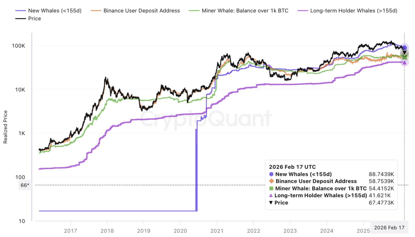 Паника продавцов на биржах несколько спала после того, как биткоин отскочил от 15-месячного минимума ниже $60 000 в начале февраля. Тем не менее ончейн-данные указывают на сохраняющийся риск дальнейшего давления: четыре уровня реализованной цены — $88 700, $58 700, $54 700 и $41 600 — теперь образуют последовательную «дорожную карту» для оценки глубины возможной коррекции.