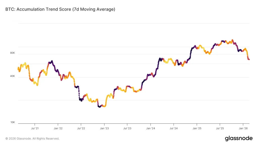 Показатели накопления немного улучшились, но аппетит крупных держателей остается слабым. Индекс Accumulation Trend Score застыл в нейтральной зоне (~0,4), что говорит о прекращении сброса, но не о возвращении уверенности китов.