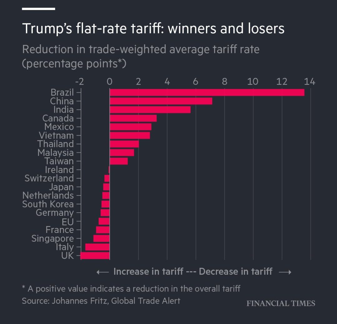 Введение единого 15-процентного тарифа США неожиданно обернулось облегчением для Бразилии, Китая и Индии — и одновременно ударило по ближайшим союзникам Вашингтона: Великобритании, Италии и Сингапуру. Такова картина, которую рисует анализ платформы Global Trade Alert на основе данных о торгово-взвешенных средних ставках.