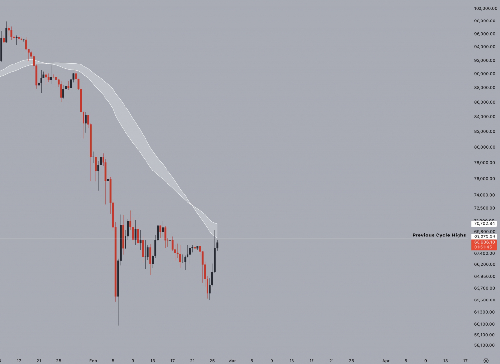 По данным Bitstamp, 26 февраля актив вернулся к уровню $67 488, потеряв за день 1%. Накануне биткоин поднимался до $70 040, предпринимая попытку восстановить два ключевых уровня: 200-недельную экспоненциальную скользящую среднюю (EMA) и старый исторический максимум 2021 года. Обе попытки закончились неудачей.