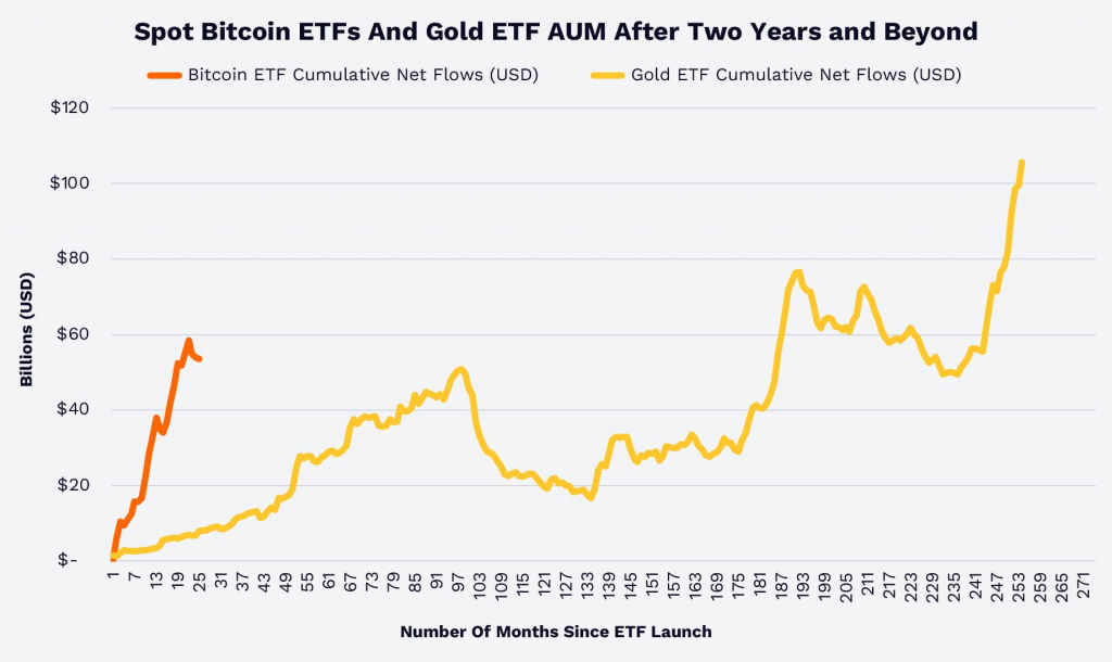 Отдельного внимания заслуживает статистика, которую привел Coin Bureau: спотовые биткоин-ETF менее чем за два года по совокупному притоку капитала сравнялись с золотыми ETF, которым для достижения того же результата потребовалось пятнадцать лет. Это один из наиболее быстрых темпов накопления активов в истории ETF-индустрии.