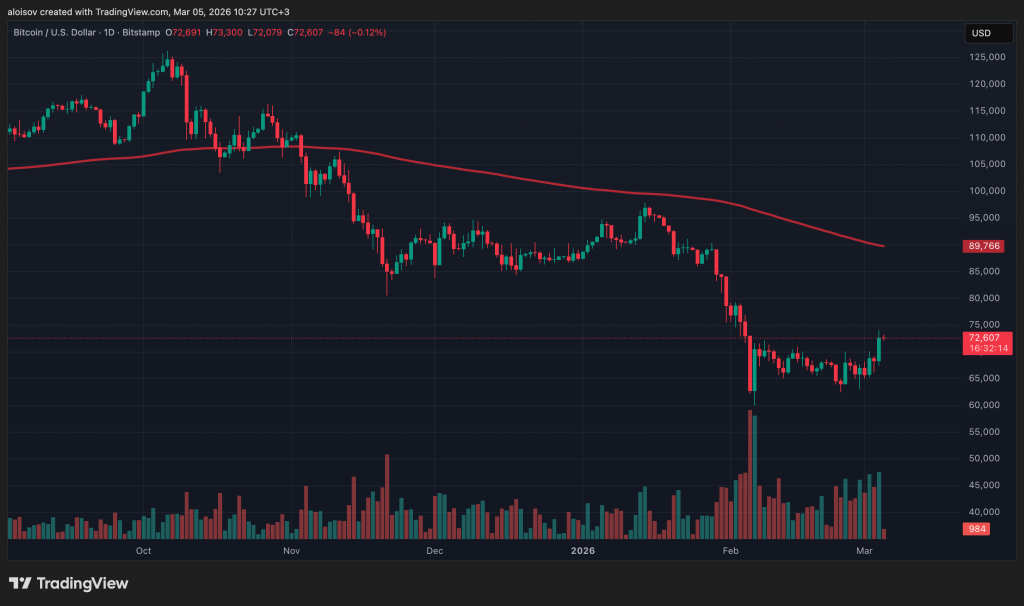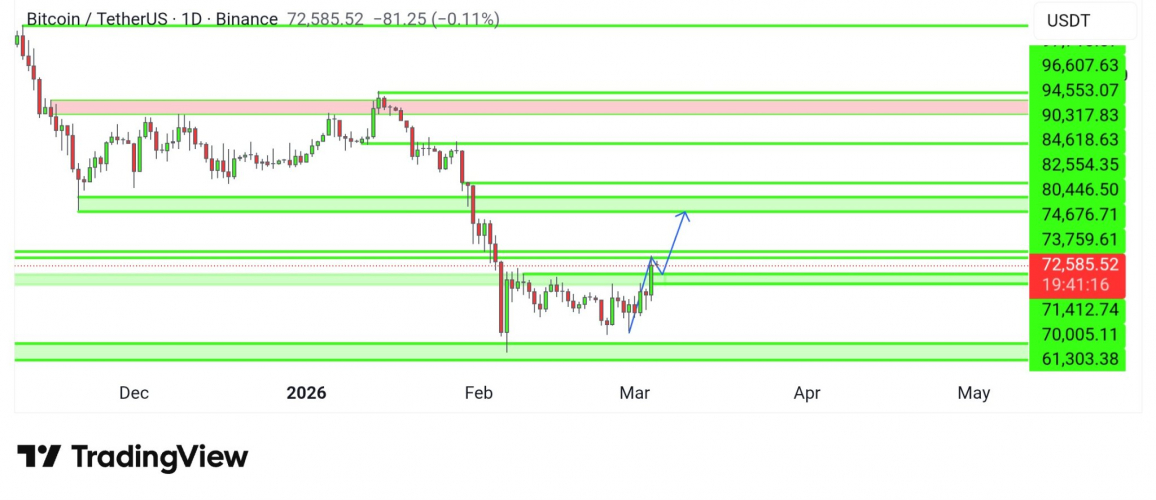 Биткоин поднялся 4 марта до $74 075 на бирже Bitstamp — рост более чем на 24% от минимума, зафиксированного 6 февраля. После долгого периода консолидации актив наконец пробил ключевой уровень сопротивления в $71 000–72 000 и закрылся выше него на дневном таймфрейме.