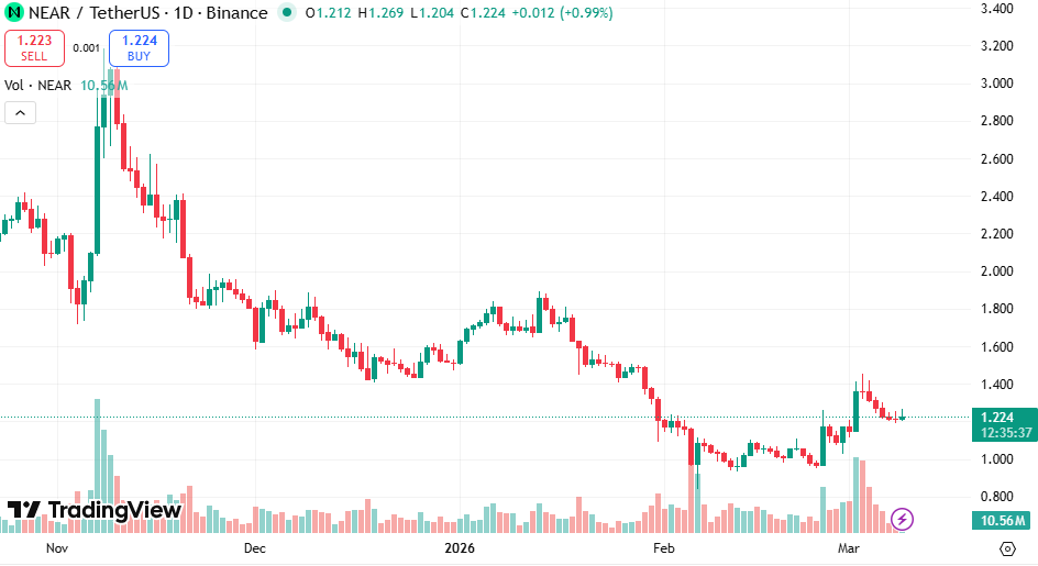 Дневной график показывает, как SAR впервые с октябрьского пробоя 2025 года опускается ниже цены на уровне $81.85, что является значимым сдвигом после месяцев, когда индикатор находился выше в качестве сопротивления. Супертренд остаётся медвежьим на уровне 94 долларов и является чертой на песке. Прайс тестировал его дважды с февраля и оба раза получил отказ. Третий тест сейчас готовится с большим импульсом, чем предыдущие попытки.