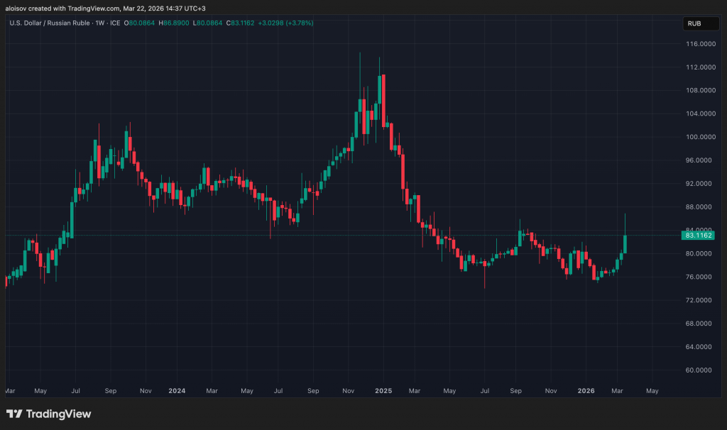 Рубль обновил минимум с начала 2025 года — на внебиржевом рынке доллар достигал 85,59 рубля. Дорогая нефть пока не помогает: валютная выручка поступает с задержкой около месяца, а Министерство финансов прекратило операции по продаже валюты в рамках бюджетного правила — примерно 12,8 млрд рублей ежедневного предложения долларов исчезло с рынка.