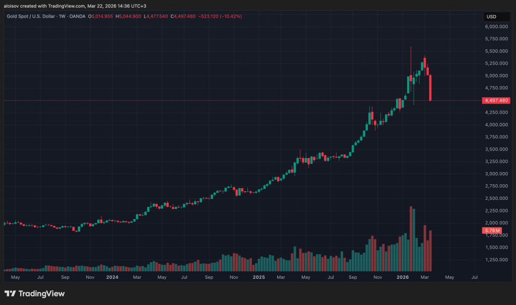 Иранский конфликт превратился в многоуровневый шок. Золото потеряло за неделю 11%, опустившись до $4 488 за унцию — крупнейшее недельное падение с 1983 года. Металл оказался под двойным давлением: рост нефтяных цен через Ормузский пролив разгоняет инфляцию, а это вынуждает ФРС держать ставки высокими. Глава ФРС Джером Пауэлл (Jerome Powell) признал, что в краткосрочной перспективе конфликт ускорит рост цен. В итоге золото страдает именно от той войны, которая сначала его разогнала.