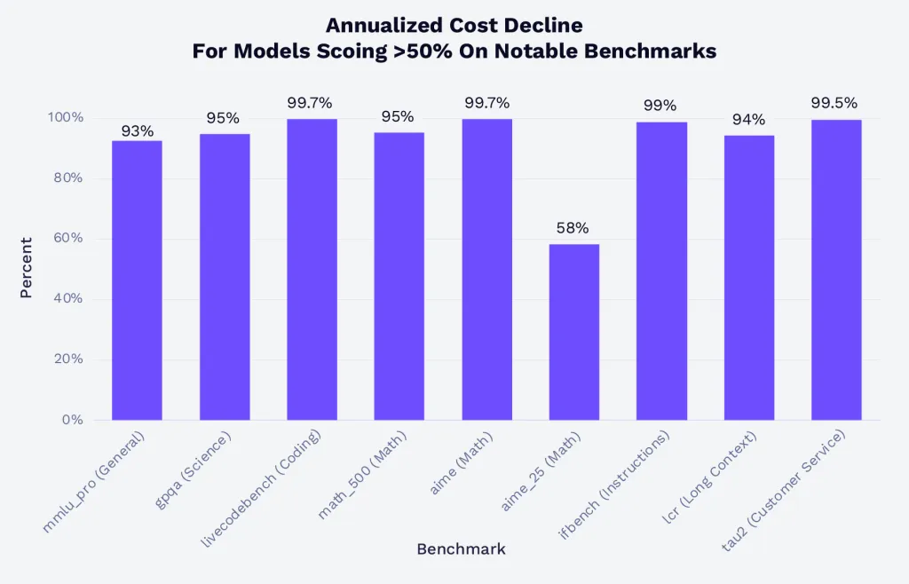 По данным аналитиков, затраты на обучение нейросетей падают на 75% в год. Инференс для моделей с результатом выше 50% в бенчмарках дешевеет еще быстрее — в среднем на 95%.