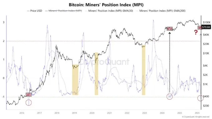 Индекс позиции майнеров (MPI) опустился до -1,04 — третьего самого низкого значения за всю историю. Аналитик CryptoQuant Игнасио Морено де Висенте назвал происходящее бычьим сигналом.