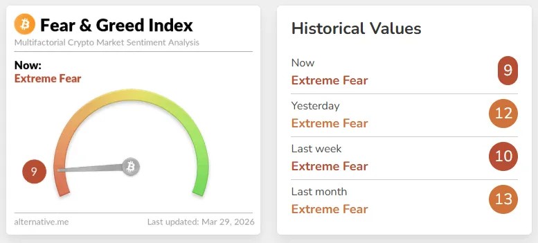 Криптовалютный индекс страха и жадности остается в зоне экстремального страха на отметке 9 пунктов.