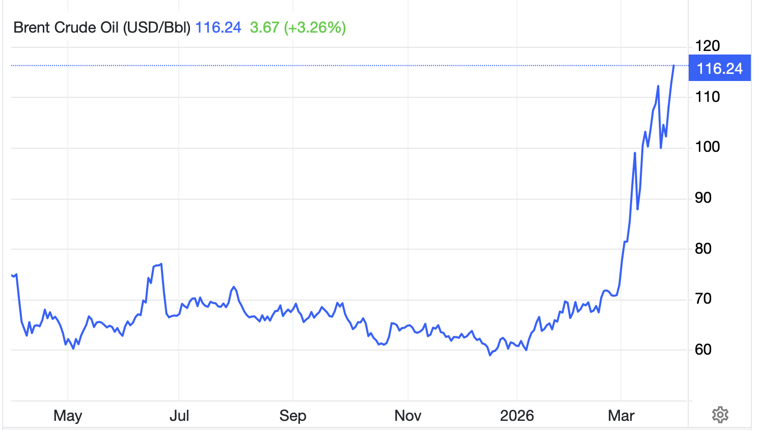 Нефть марки Brent торгуется выше $116 за баррель — и это ещё не предел: аналитики Macquarie Group предупредили, что при затяжном конфликте с участием США, Израиля и Ирана и сохранении блокады Ормузского пролива цена может достичь $200 за баррель.
