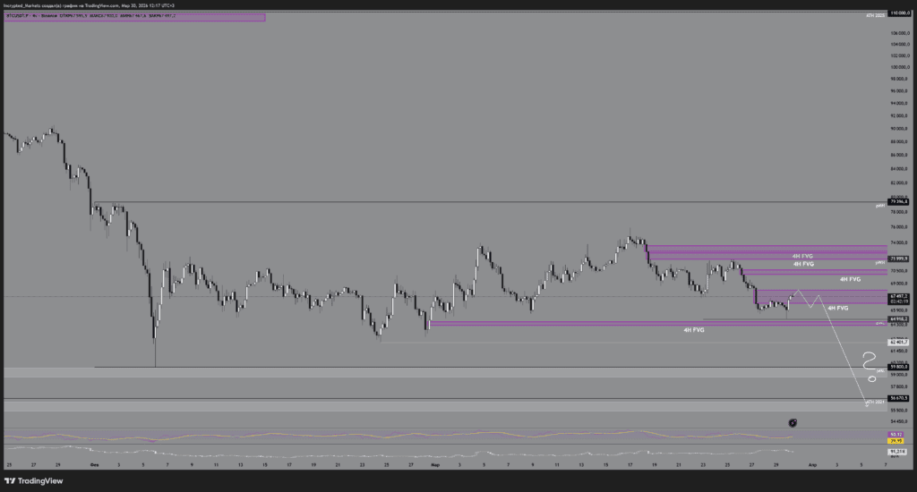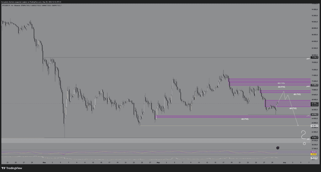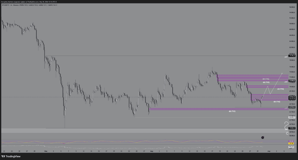 Логика: через манипуляцию в понедельник мы делаем легкий свип вверх, собираем локальные стопы, после чего откатимся для снятия минимумов предыдущего месяца. Сценарий похож на первый (A), но без похода за ликвидностью на $70 000, ограничившись лишь полным перекрытием 4Н FVG. Ключевым рубиконом станет тест зоны $64 000-$62 000 и способность покупателя удержать этот уровень.