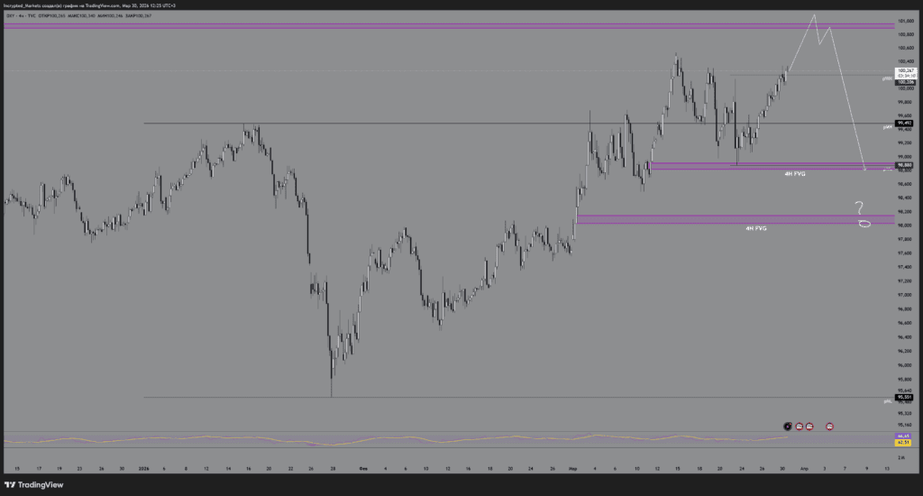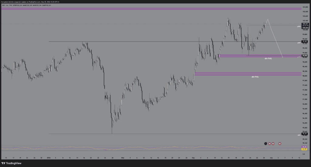 - поддержка: ближайший структурный уровень 99,492. Ниже находится главный магнит для цены — массивный 4H FVG в диапазоне 98,800.