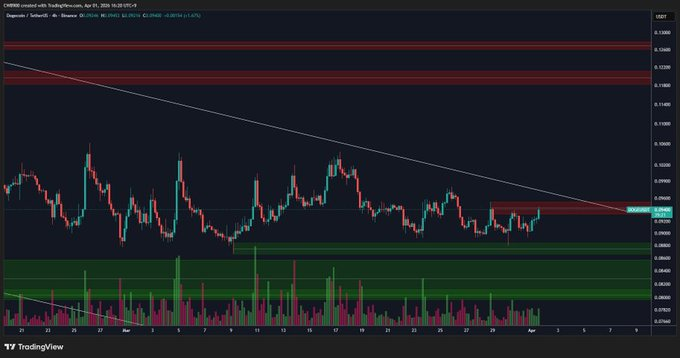 Тем временем Дож пытается построить базу. Последние свечи показывают цену, держащуюся чуть ниже зоны $0.10, что стало основным уровнем, за которым трейдеры следят за направлением движения.