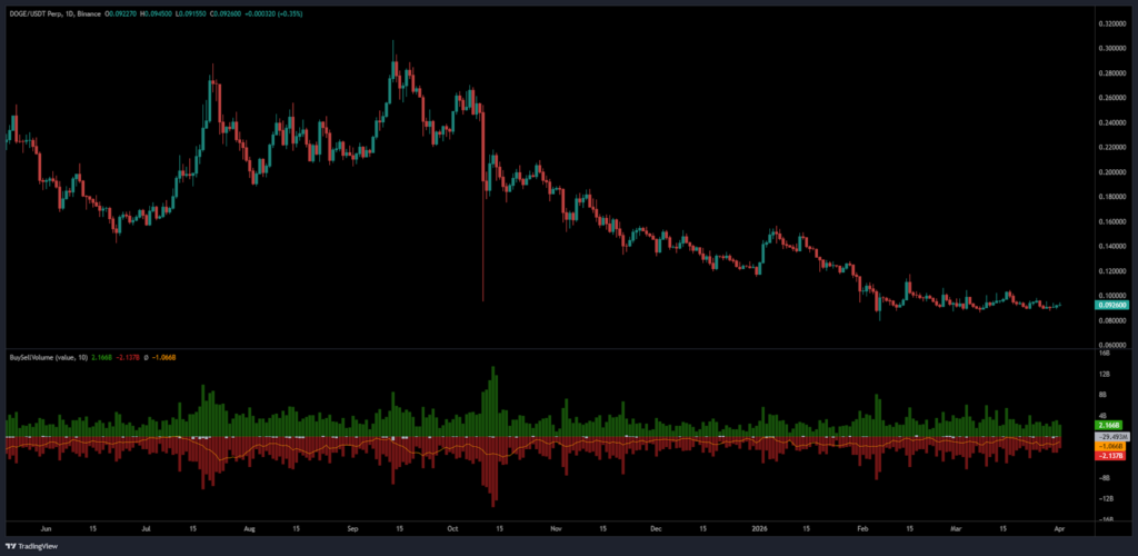 График Coinalyze показывает , что $DOGE/USDT торгуется около $0.0926. Более широкая дневная структура по-прежнему показывает длительное снижение от максимумов 2025 года выше $0.20 и около $0.30 на пике. Цена несколько месяцев снижалась, прежде чем выровниться в узком диапазоне возле текущих уровней.