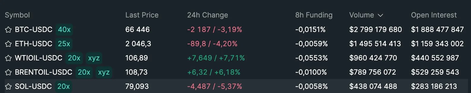 Контракт BRENTOIL-USDC остается одним из самых востребованных на Hyperliquid. Пара занимает четвертое место по объему торгов с показателем $789 млн при открытом интересе в $529 млн. Третью строчку удерживает другой сырьевой дериватив, привязанный к нефти марки WTI.