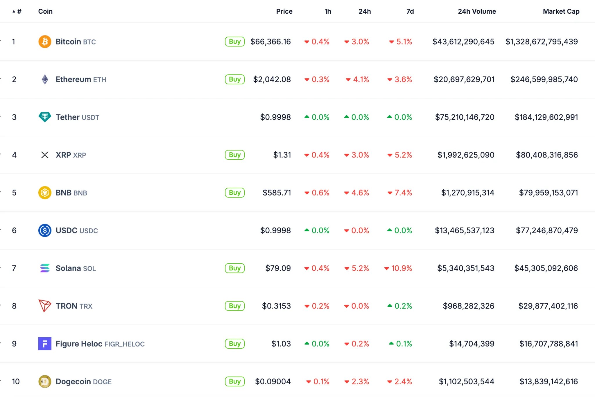 За последние сутки цена биткоина опустилась на 3%. На момент написания первая криптовалюта торгуется около $66 400.