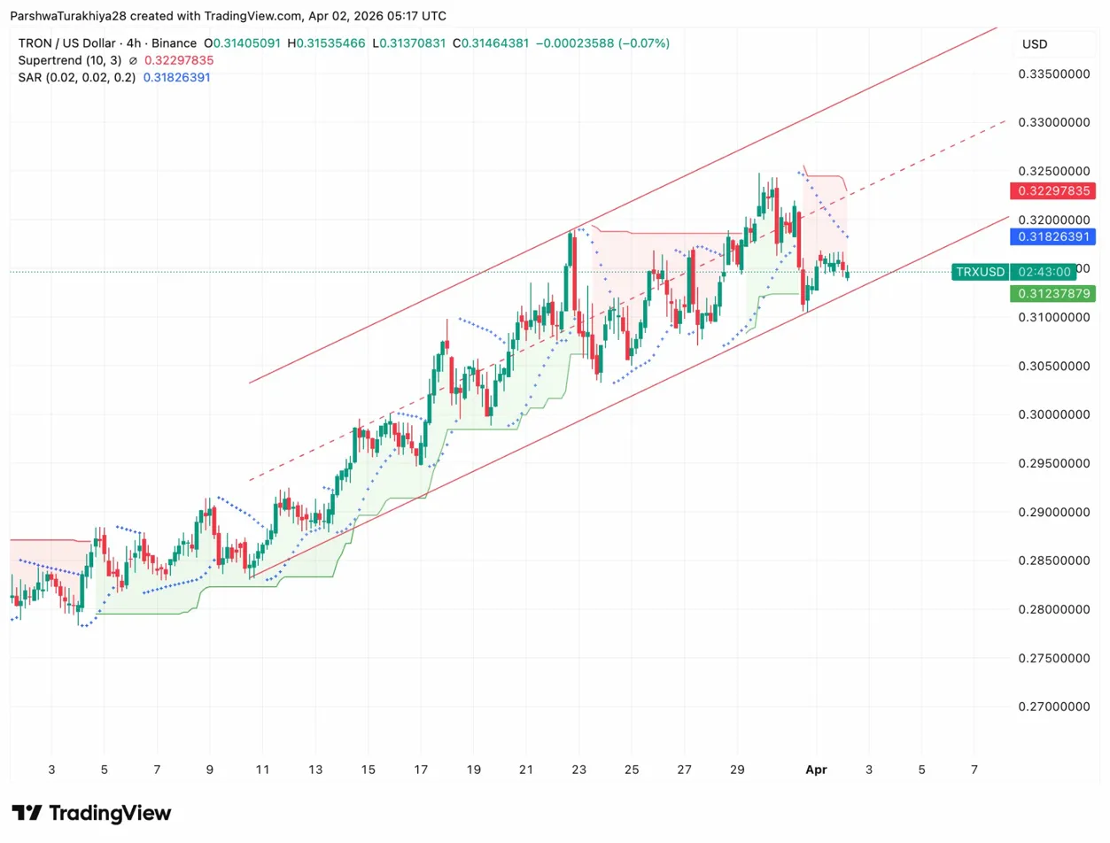 TRON интегрировалась с Zero Hash 31 марта, впервые предоставив регулируемым предприятиям прямой доступ к $TRX и TRC-20 $USDT. $TRX торгуется по $0.3146, удерживая месячный восходящий канал с сокращающимися накладными расходами Supertrend и SAR.