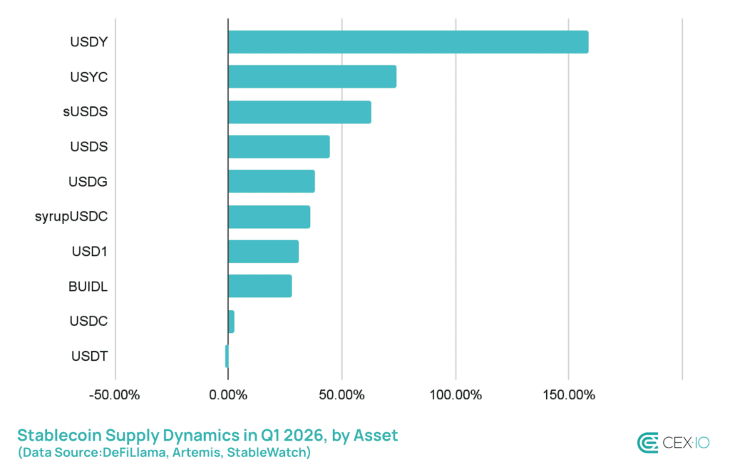 Предложение $USDT в I квартале 2026 года сократилось на $3 млрд, $USDC — выросло, на $2 млрд. Вместе с тем эти показатели не идут ни в какое сравнение с категорией доходных стейблкоинов. В целом их предложение выросло на 22% или на $4,3 млрд.
