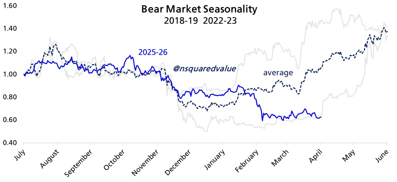 Отдельное внимание аналитики уделяют сезонности. Экономист сети Тимоти Петерсон (Timothy Peterson) отметил, что апрель часто становится месяцем восстановления в рамках медвежьих фаз.