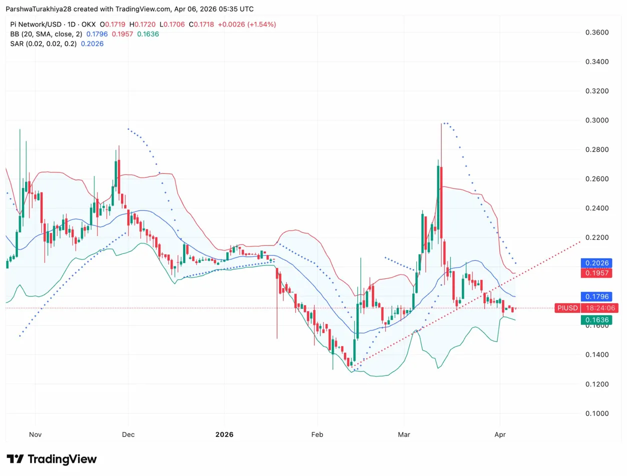 Дневный график показывает PI после мартовского пикового пика около $0.3050, что было вызвано ожиданием Дня Пи и листингом Kraken. После того как оба события прошли, произошёл классический спад по продаже новостей, оттолкнув цену обратно к нижней полосе Боллингера на уровне $0.1636. Эта полоса снизила февральский минимум около $0.1380, а цена сейчас находится чуть выше него на уровне $0.1718.