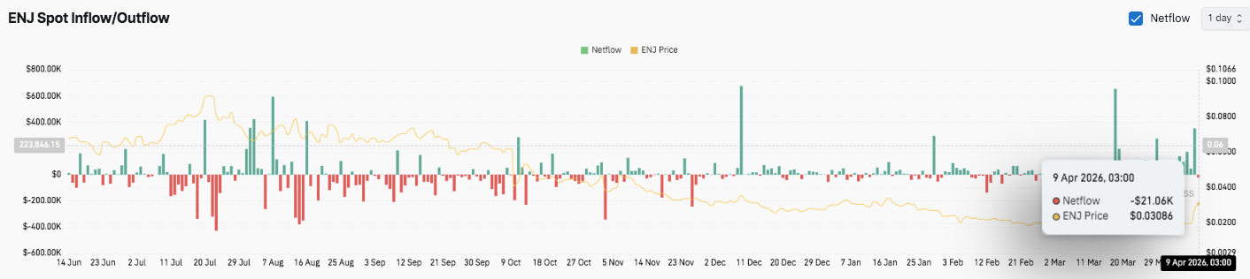 Прогноз $ENJ зависит от того, будут ли покупатели достаточно долго защищать поддержку $0.025, чтобы бросить вызов сопротивлению $0.0318. Если бычий импульс усилится, цена может увеличиться до $0.0456 и выше. Кроме того, сильный объём и притоки поддержат этот сценарий.