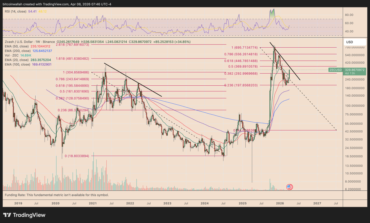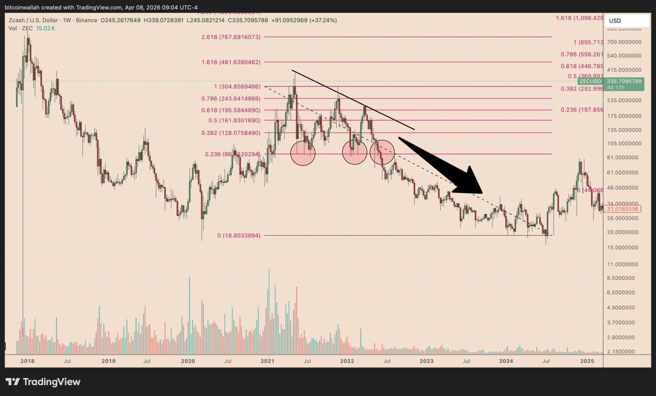 Аналитики обращают внимание на структуру текущего движения. После пика в 2021 году $ZEC показывал серию резких отскоков, которые заканчивались новым снижением.